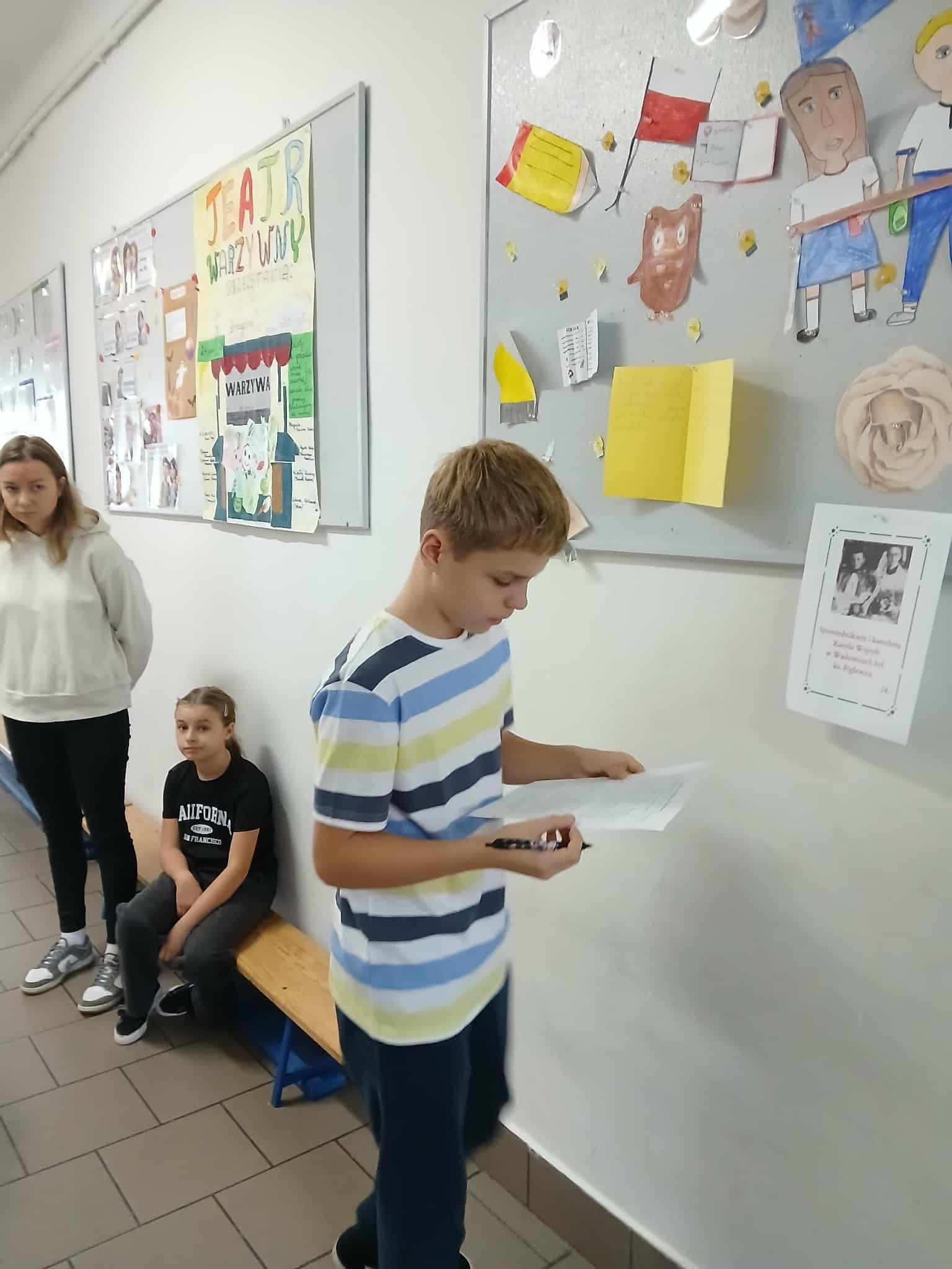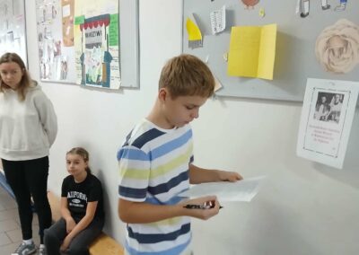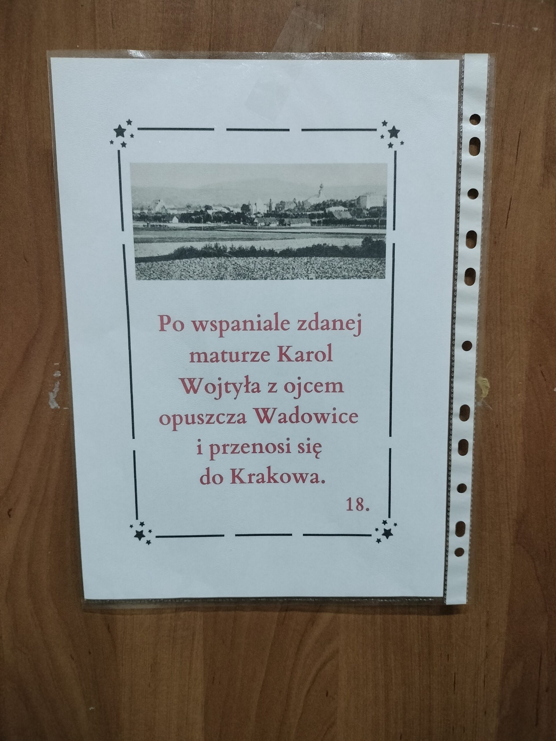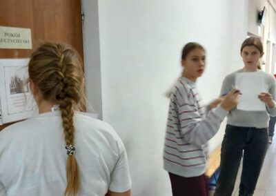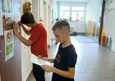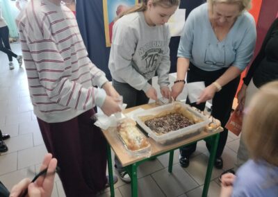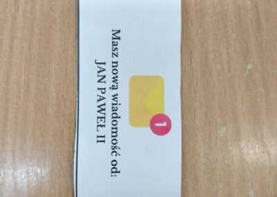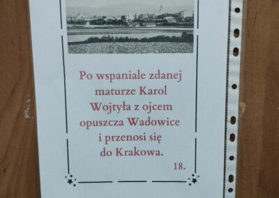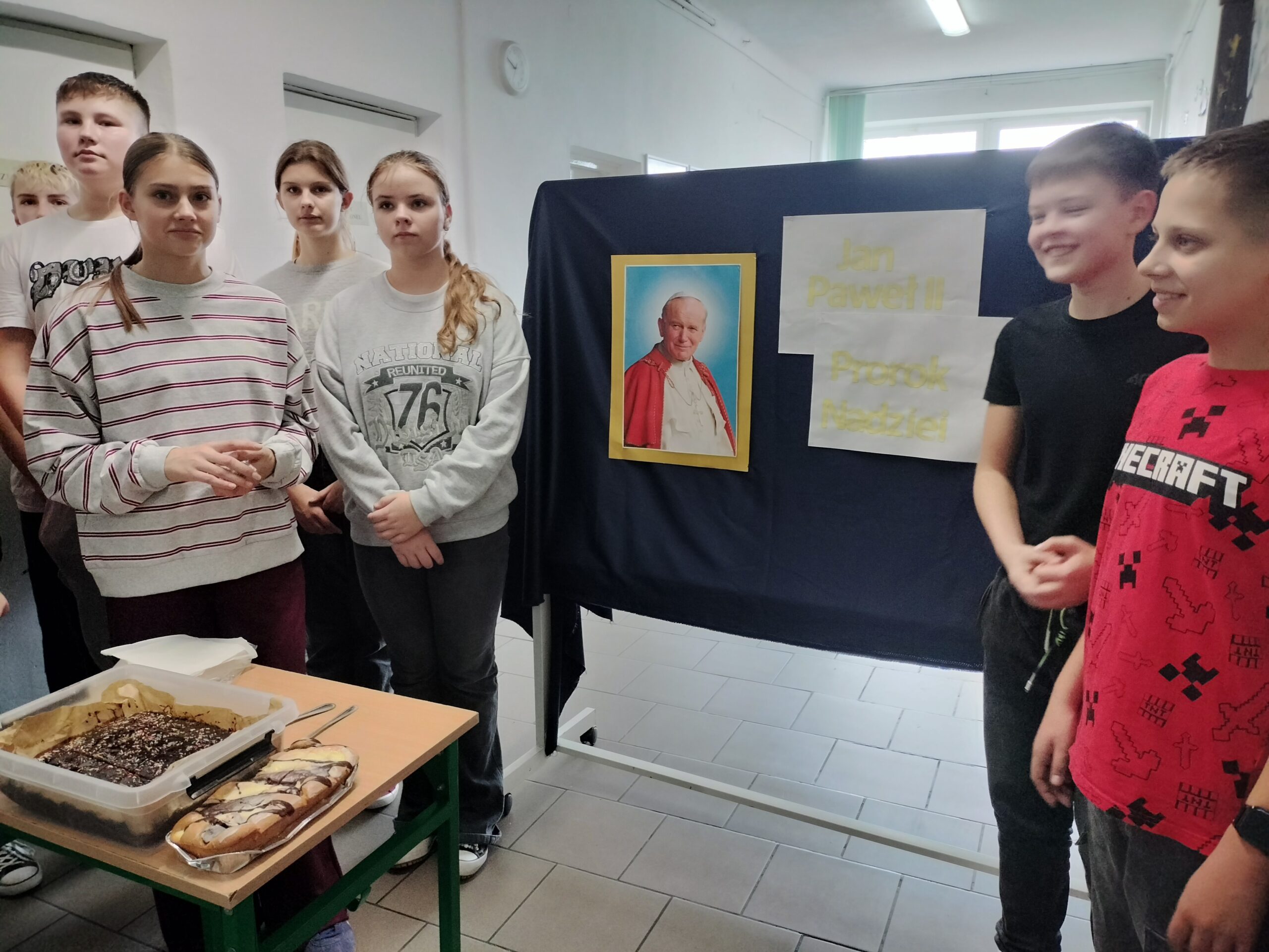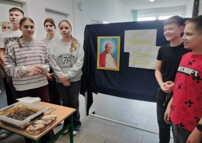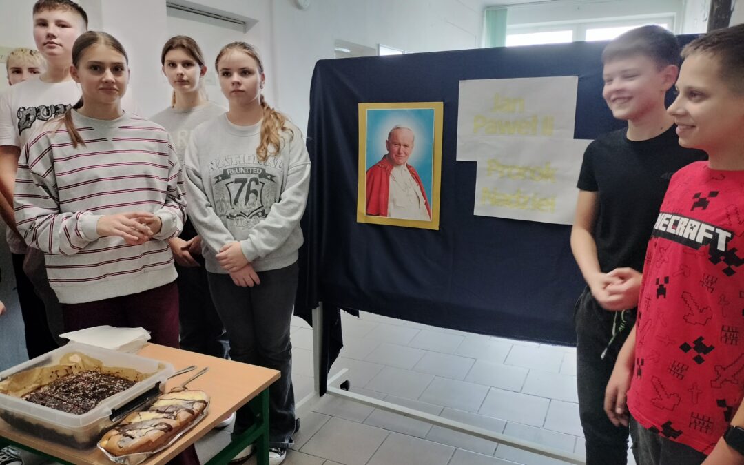 Tradycyjnie w drugiej połowie października w naszej szkole obchodzimy Dzień Papieski ku czci Świętego Jana Pawła II. Cała nasza społeczność szkolna spotkała się na szkolnym korytarzu aby wspólnie wspominać Papieża. Podczas przerw szkolnych rozbrzmiewały najpiękniejsze utwory dedykowane Karolowi Wojtyle. Wspólnie odśpiewaliśmy ulubioną oazową pieśń Papieża „Barkę”. Nie mogło zabraknąć słynnej „papieskiej kremówki”. Każdy uczeń otrzymał kawałek ciasta z wiadomością, która zawierała sentencję. W różnych zakątkach szkoły pojawiły się notatki i ciekawostki na temat życia Jana Pawła II. Uczniowie rozwiązywali zagadki, odszukując inforamcji.