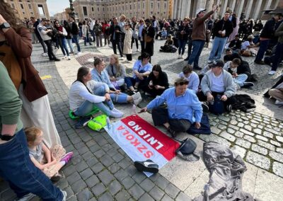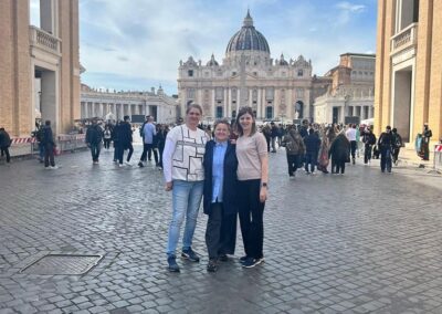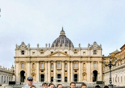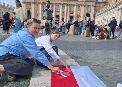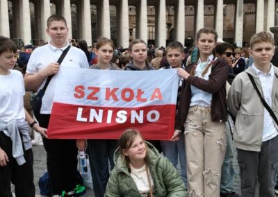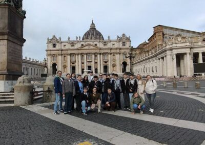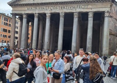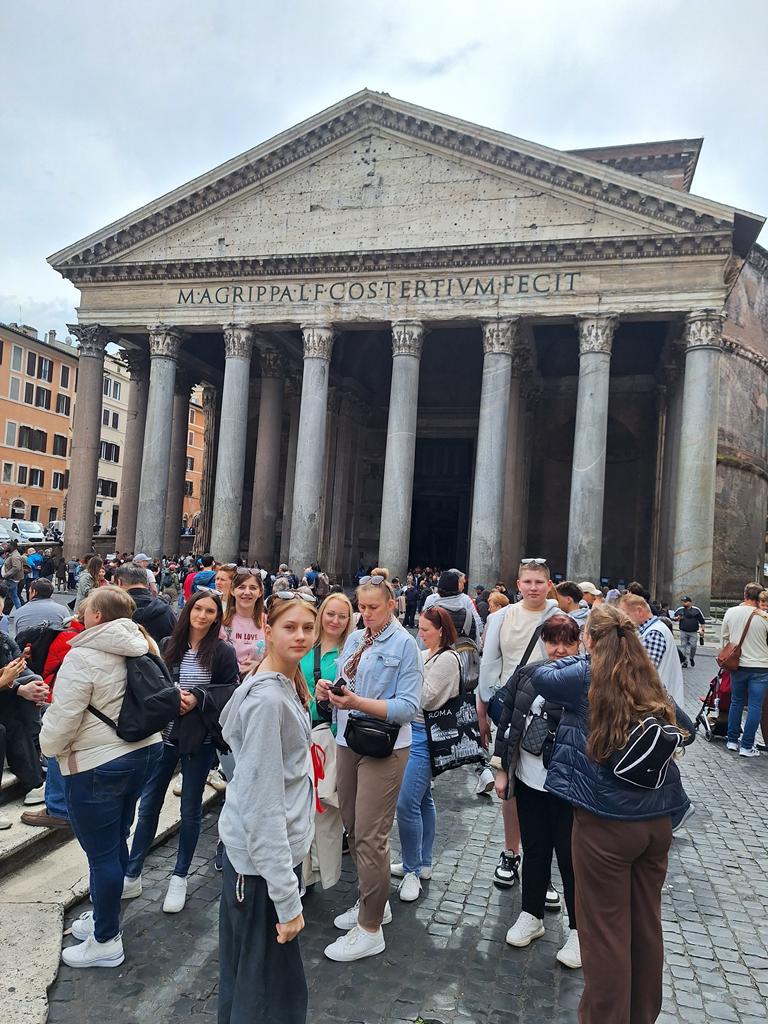 Drugiego dnia już od samego rana wycieczka dotarła do Watykanu, by zwiedzić Bazylikę św. Piotra, wejść na jej kopułę i podziwiać panoramę Rzymu. Po mszy świętej w Bazylice cała grupa udała się na Plac św. Piotra by wziąć udział w nabożeństwie Anioł Pański celebrowanym przez Papieża Leona XIV. Było to wyjątkowe i bardzo podniosłe doświadczenie. Następnie idąc w kierunku hotelu, nasza wycieczka odwiedziła najważniejsze miejsca Rzymu: Piazza Navona, Panteon, Fontannę di Trevi oraz Bazylikę św. Piotra w Okowach. Każde z tych miejsc zachwyciło uczestników swoją historią i niepowtarzalnym klimatem. Nie mogło się też obyć bez spróbowania specjałów włoskiej kuchni: pizzy, makaronu, ravioli i oczywiście przepysznych lodów.